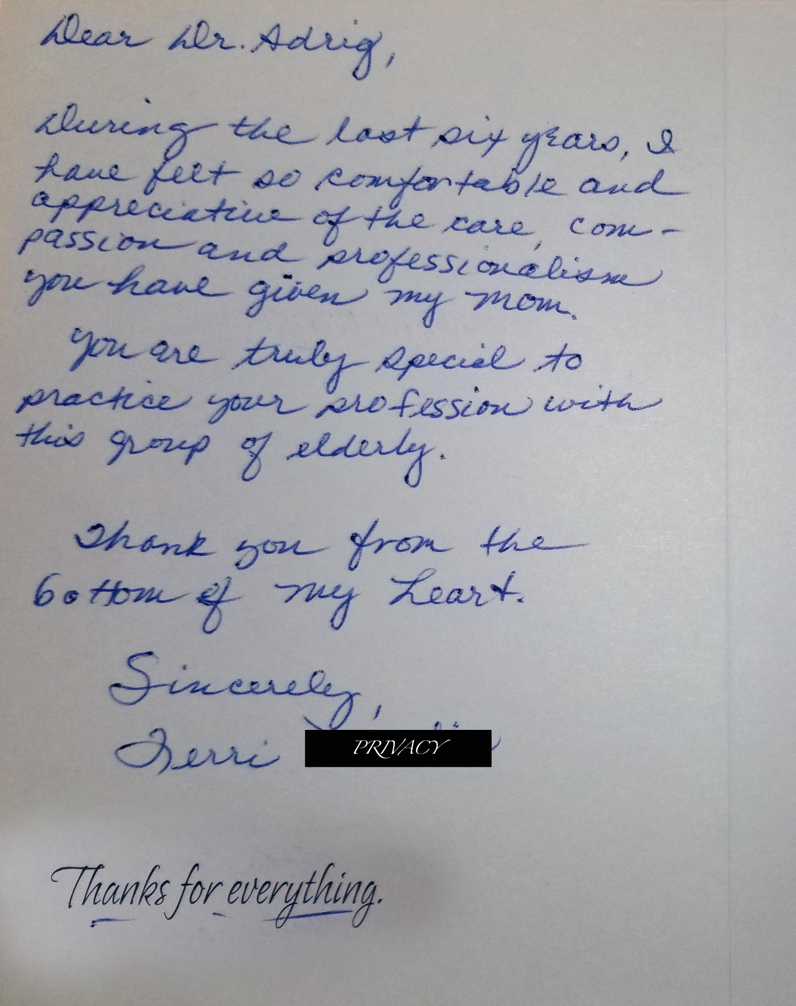 "You are truly special to practice your profession with this group of elderly" - Sherri M.